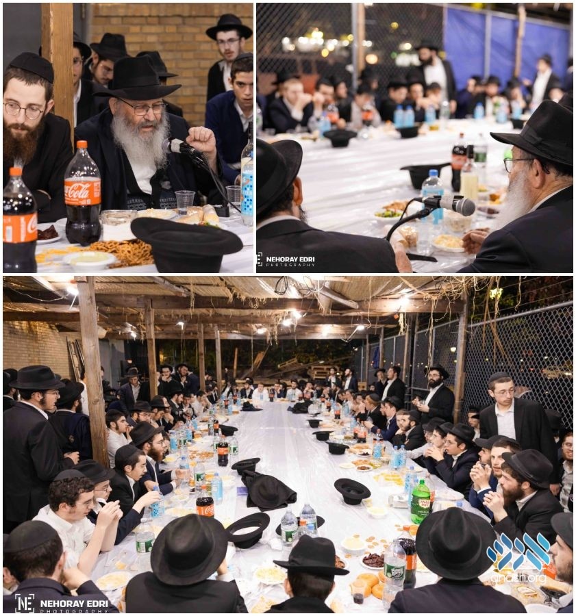 Shliach to Hartford, Connecticut, Rabbi Yoske Gopin, led a Simchas Beis Hashoeivah farbrengen for bochurim in the sukkah of the Vaad Hatmimim on Eastern Parkway, just across from 770.
