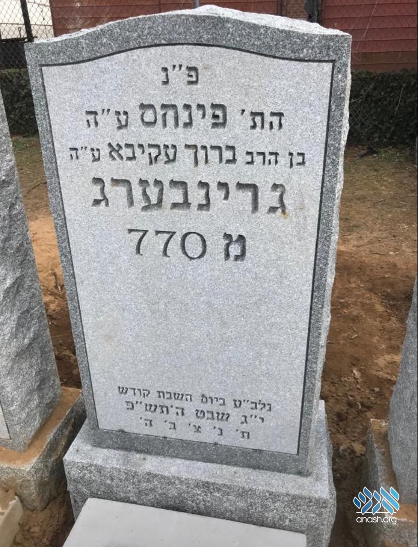 The matzeiva of Pinchos ‘Pinto’ Greenberg, unveiled today, simply reads ‘Hatomim Pinchos…from 770.’