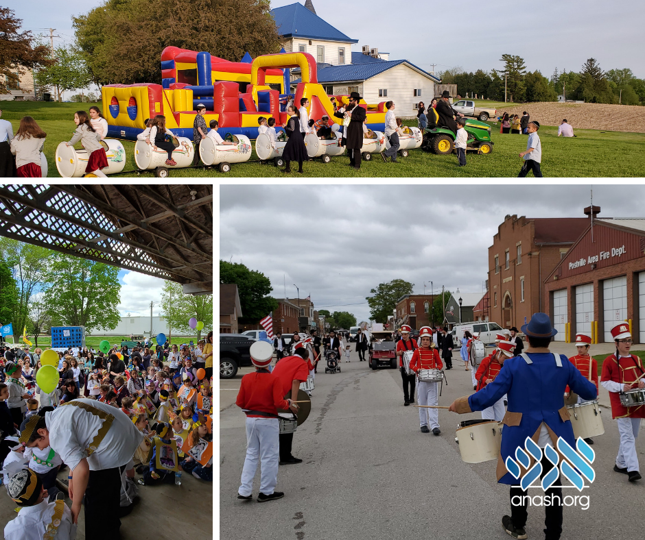 Children and adults in gathered for a grand parade and rally in Postville, Iowa. The rally was led by Rabbi Mendel Reices with Rabbi Levi Goldstein playing chassidishe music.