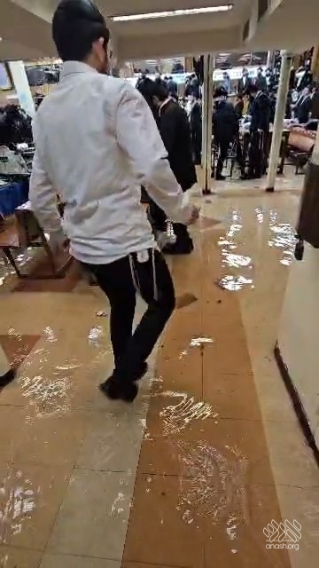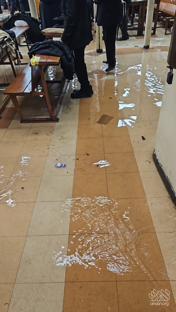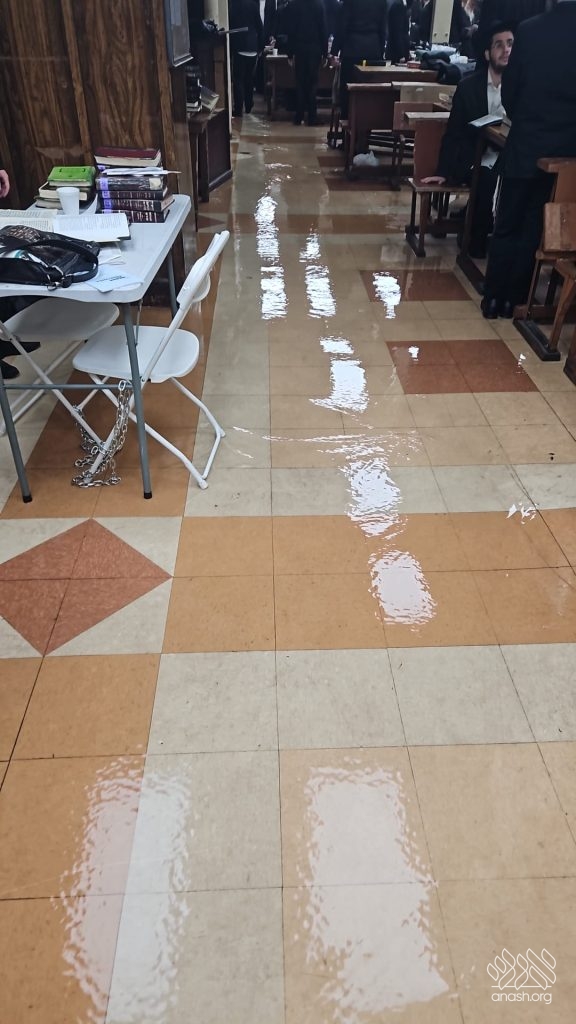 Inside 770, water seeped into the lower level, pooling around the lockers and spreading across the floor. Even as the cleanup began, bochurim and Anash continued learning and davening, undisturbed by the commotion.