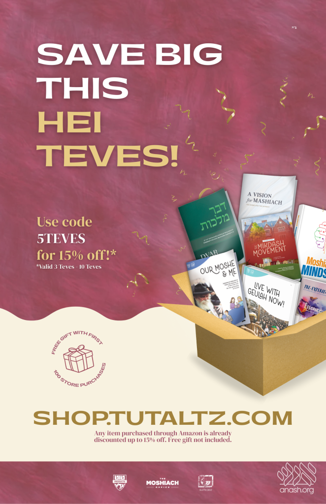 To support that effort, the Moshiach Office at Merkos 302 is marking Hei Teves with a limited-time sale (for one week starting Tuesday, Dec 23) on all Moshiach-related books and curriculum: