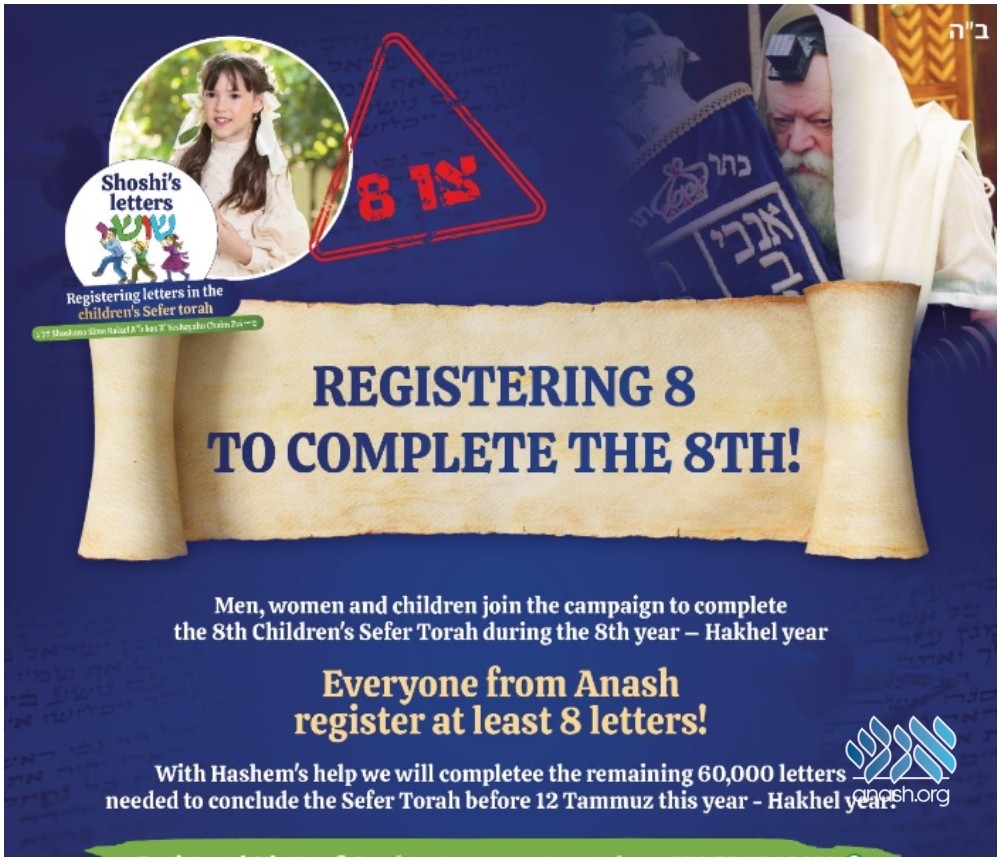 The eighth Children’s Sefer Torah is almost complete and ready for the Hachnasas Sefer Torah on Chof Av. In order to finish off with the last letters needed before the event, organizers will be raffling off many great prizes for any person who sells eight letters.