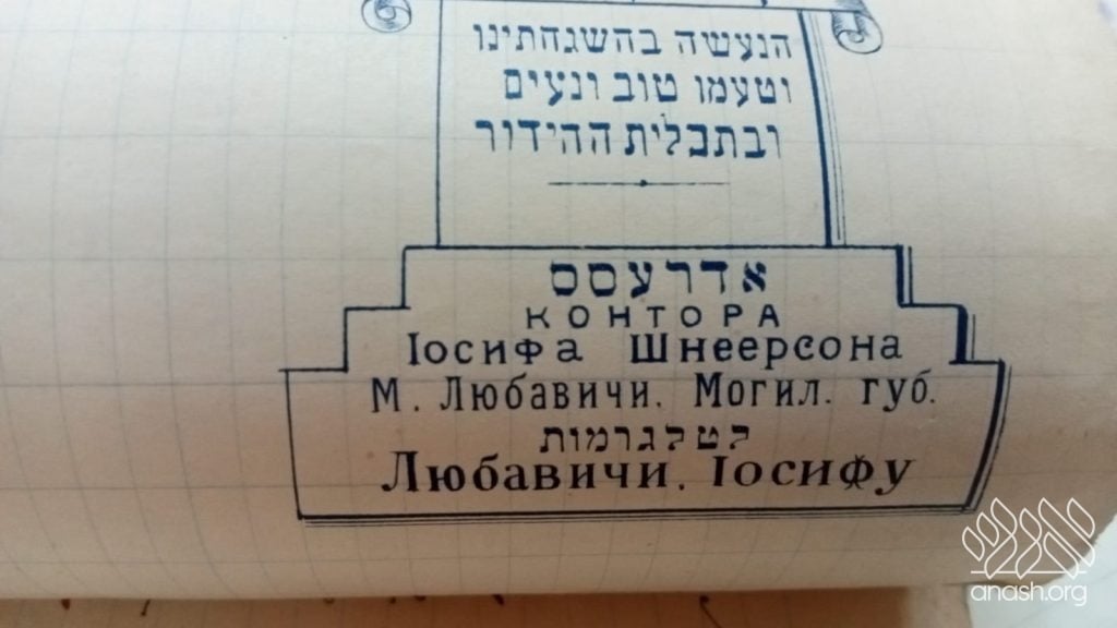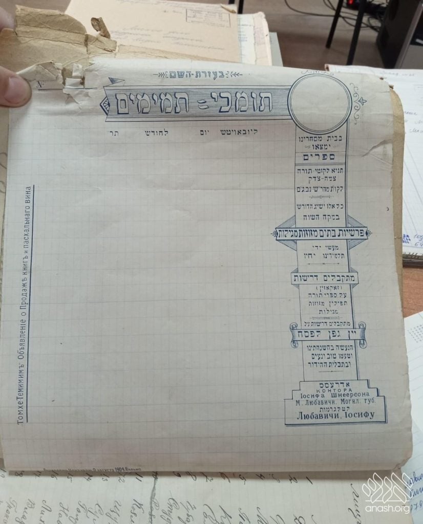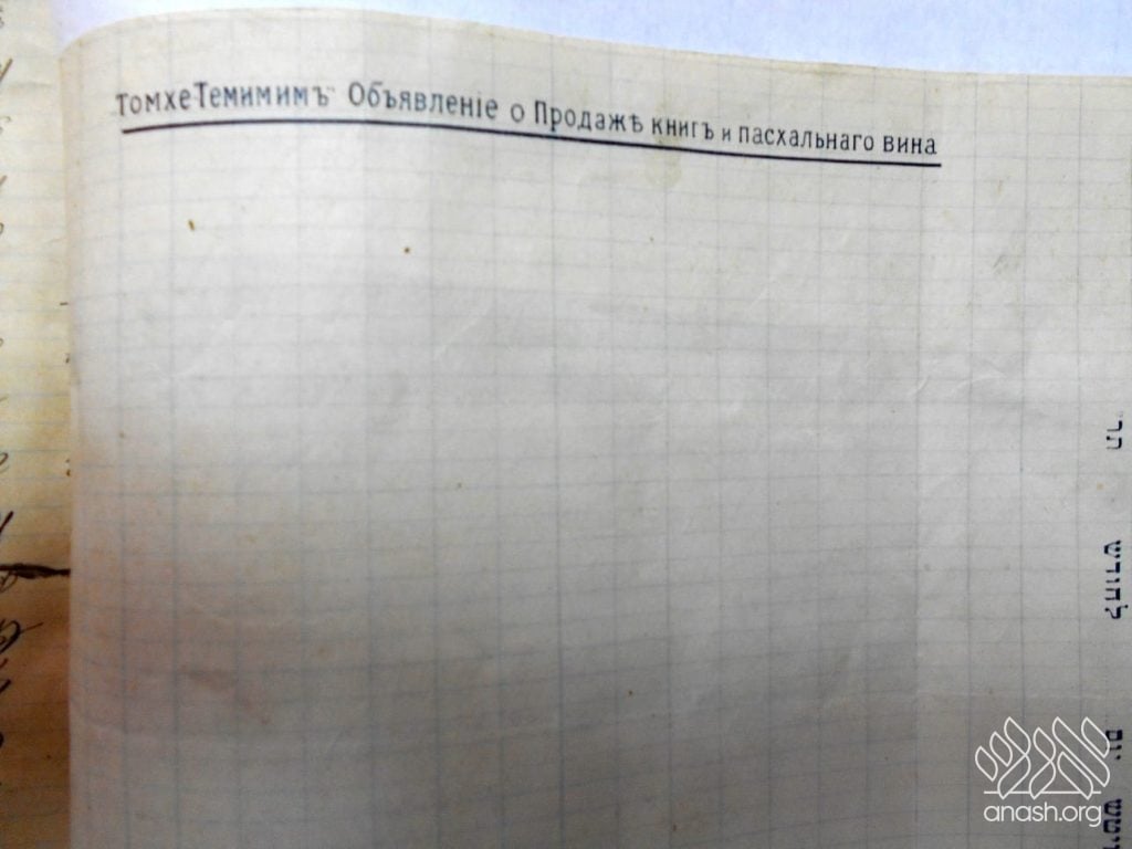Additional text found on the documents includes references in Russian to “Tomchei Temimim” and announcements regarding the sale of books and Pesach wine, further reinforcing the dual-purpose nature of the materials.