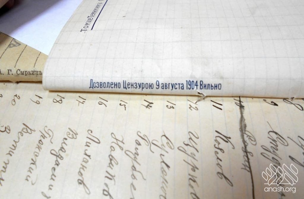 Among files containing lists of army recruits from 1918, Rabbi Gordon discovered official stationery that originally belonged to the Lubavitch yeshiva. These documents, later reused by the draft office for recordkeeping, were printed with the name of the Frierdiker Rebbe in Russian, identifying him as the active director of the yeshiva.