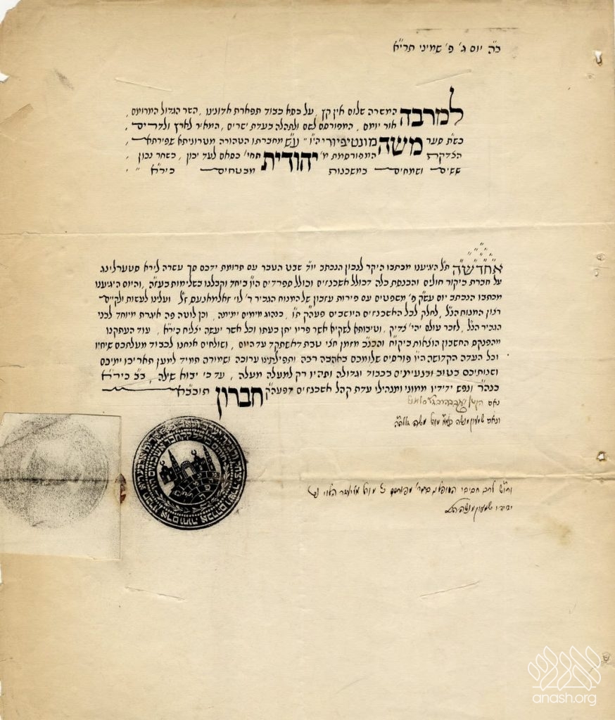 Reb Shimon Menashe Chaikin was born around the year 5562 (1802) and moved to Tzfas when he was 18 years old. Later on, he moved to Chevron along with all the Chabad chassidim, as per the instruction of the Mitteler Rebbe. He eventually became the rov there for all Ashkenazim. He passed away on 29 Sivan 5653 (1893).