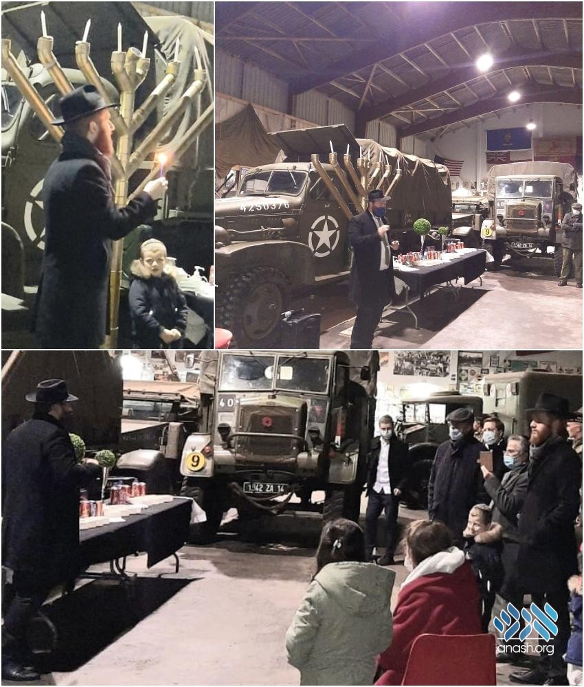 75 Years after the memorable and victorious D-Day, Rabbi Motti and Zlata Lewin, Shluchim to the city of Caen, France held the first Menorah lighting at a Normandy military camp.