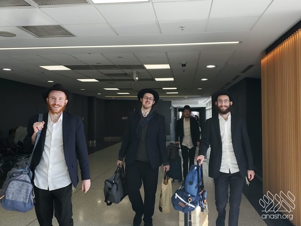 A delegation of six Lubavitcher bochurim touched down in Sydney, Australia, this morning on a critical mission dispatched by Merkos L’Inyonei Chinuch to bolster the local Chabad community following the horrific massacre on the eve of Chanukah at Bondi Beach. Their arrival marks the next phase of “Behemshech Habinyan” – the Rebbe’s famous words on continuing the building amidst the ruins.