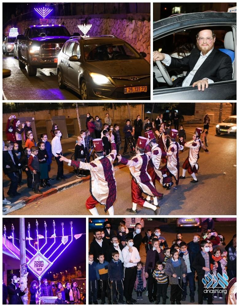 A convoy of cars with glowing menorahs and a music truck blasting Chanuka tunes played by Avremi Cohen and accomapnied by singer Gad Shalom and the Hop Kozak dancers led by Yoni Weiss, traveled for several hours throughout Yerushalayim neighborhoods and delighted the residents with the dancing band.