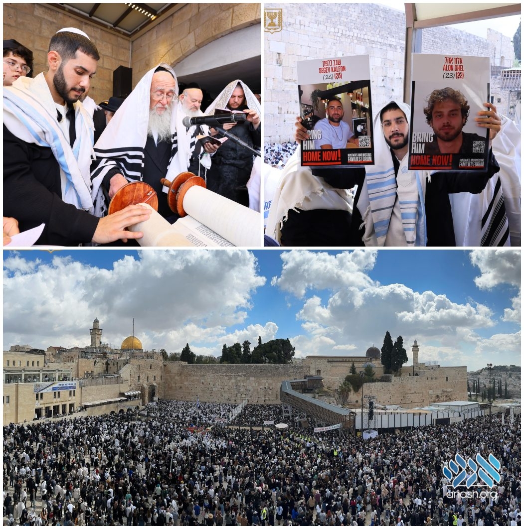 Eliyah Cohen, who was recently released from Hamas captivity, led the Birkas Kohanim at the Kosel on Tuesday morning to over 50,000 people, including many hostage families.