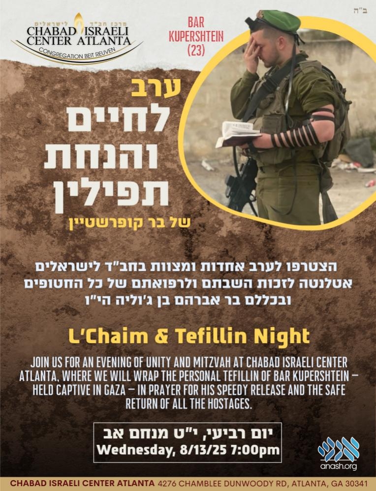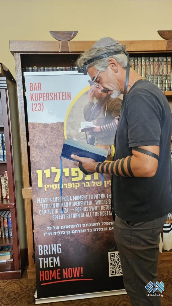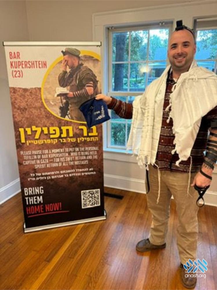 An incredibly moving event took place last week at the Chabad House for Israelis in Atlanta, Georgia, when dozens of men gathered to put on tefillin with the very tefillin of Bar Kuperstein, who is still being held hostage in Gaza, and to daven for his immediate release.
