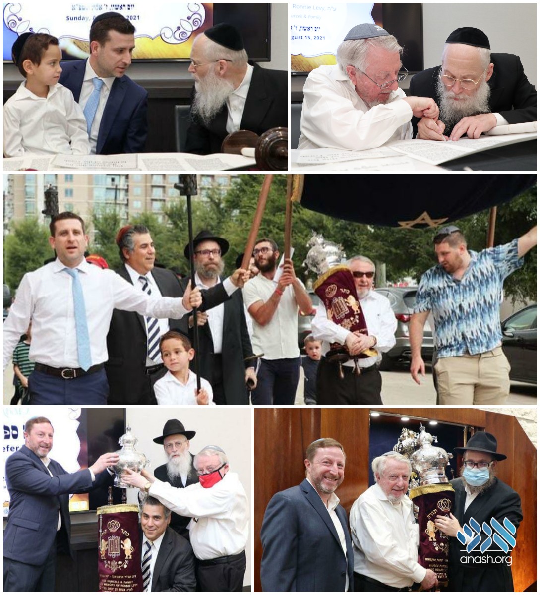The Torah was sent to New York, where the sofer Rabbi Moshe Klein checked it. A missing letter ‘vov‘ was added; the tattered yeri’os were fixed and cleaned until it was good as new, and the refurbished Sefer Torah was welcomed at a Hachnosas Sefer Torah celebration at Chabad of Uptown in Houston, Texas. Ronnie Levy traveled from South Africa to participate in the simcha that he had facilitated.