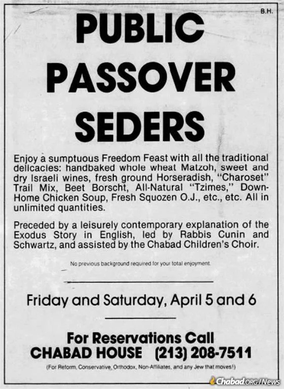 These new Chabad centers set out to engage Jews with little or no communal affiliation, offering them accessible entry points to Jewish life and mitzvahs. The broad cultural changes meant that for many attending a Passover seder was no longer a given, but a choice, and one they often did not make. Naturally, Chabad at UCLA began arranging a Passover seder, as did other Chabad centers on university campuses.