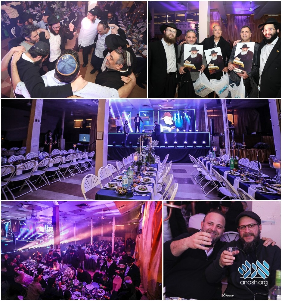 The banquet guests began filing into 770 where they were greeted by their bochurim, subsequently sitting down for a multi-course meal. The crowd enjoyed musical performances, inspiring speakers, and a play performed by young boys. They also received inspiration directly from the Rebbe, watching videos on the large screen in the middle of the room.