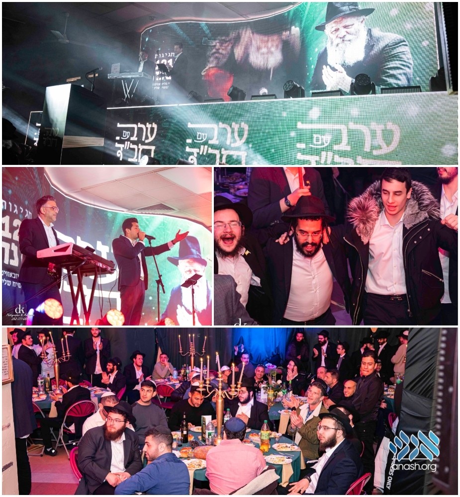 The banquet guests began filing into 770 where they were greeted by their bochurim, subsequently sitting down for a multi-course meal. The crowd enjoyed musical performances, inspiring speakers, and a play performed by young boys. They also received inspiration directly from the Rebbe, watching videos on the large screen in the middle of the room.