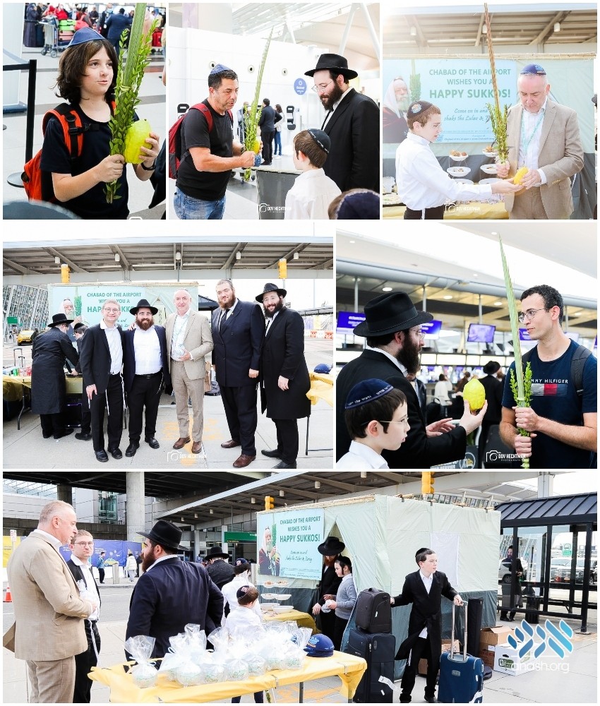 Hundreds of Jewish airline passengers performed the mitzvos of Sukka and Lulav at the Chabad Air Sukka and mitzva booth at JFK’s terminal 4.