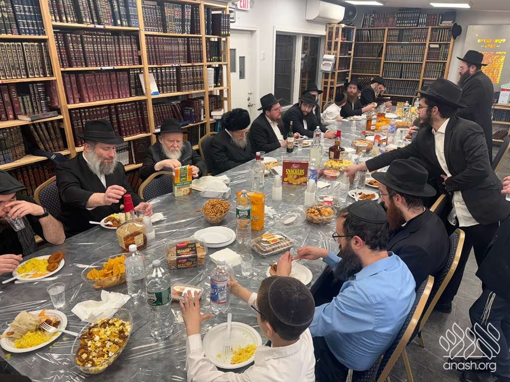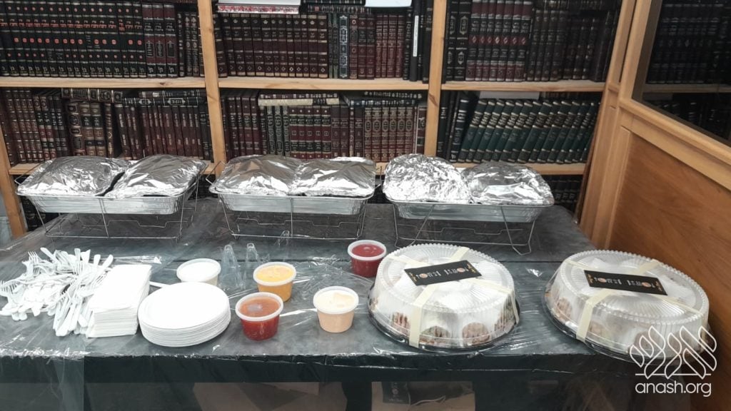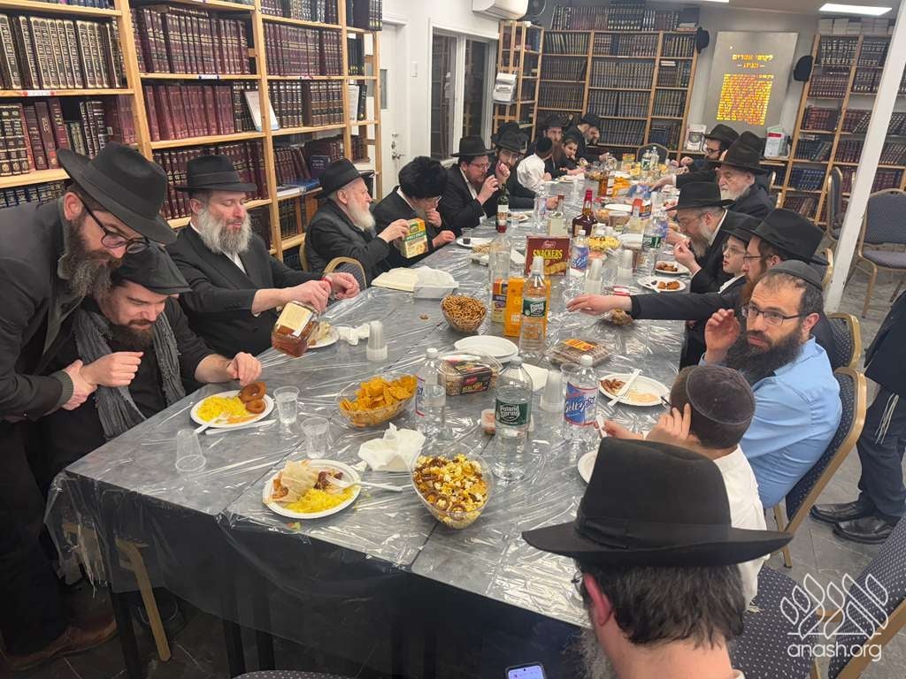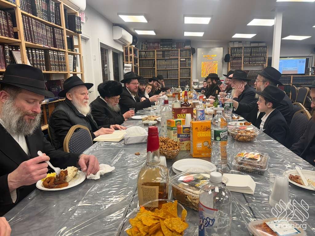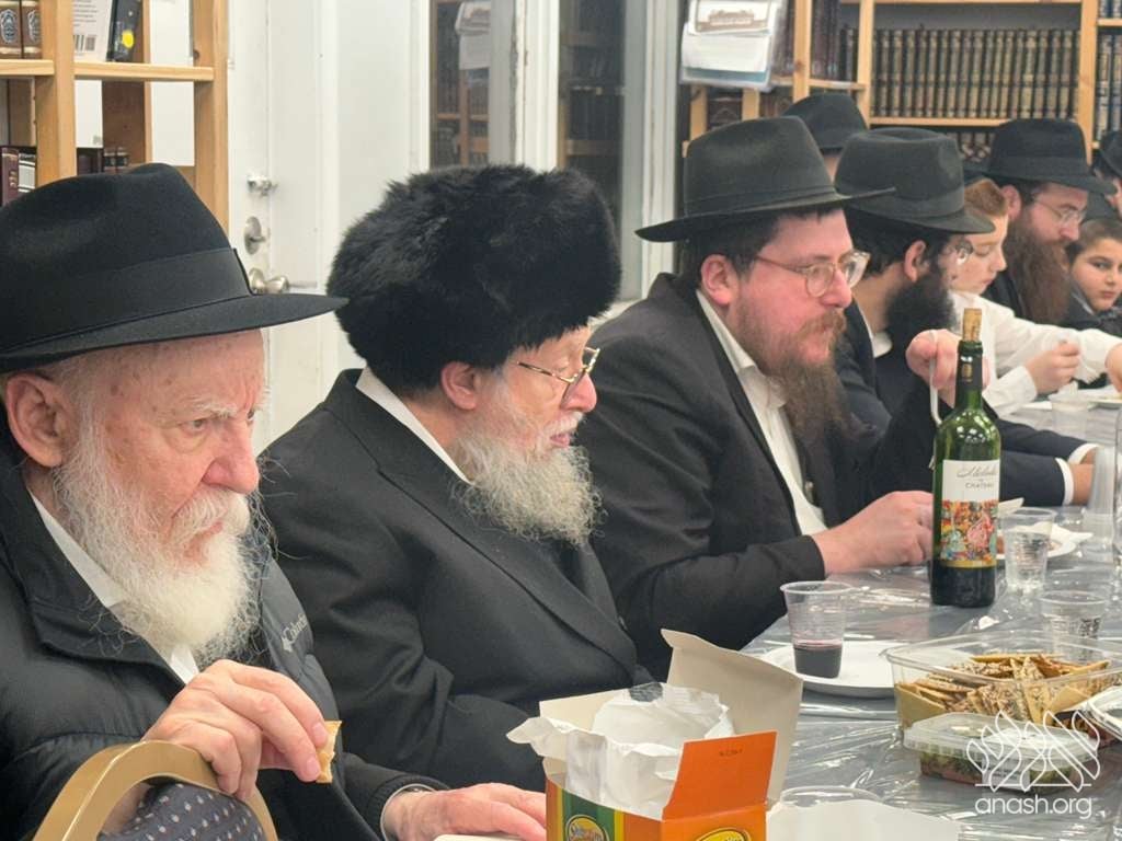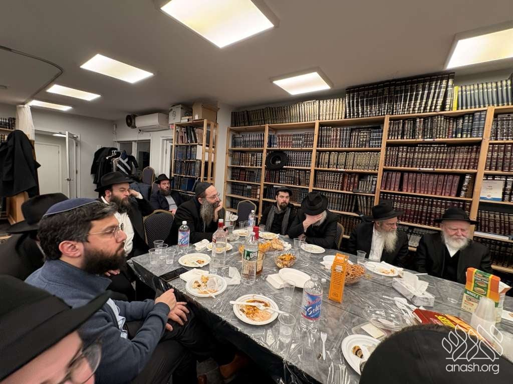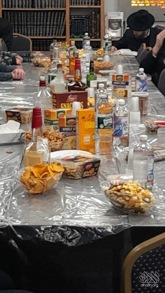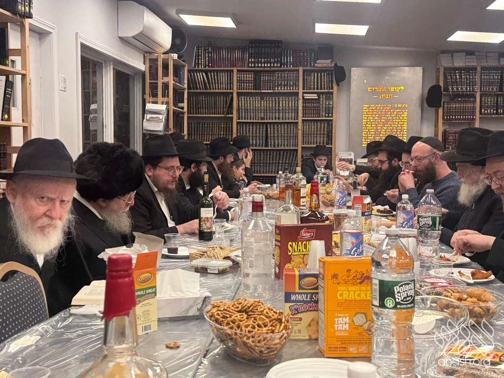 Despite a fall on ice before the farbrengen, Rabbi Nosson Gurary insisted on going ahead with the farbrengen at Beis Levi Yitzchok shul in Pomona, NY.