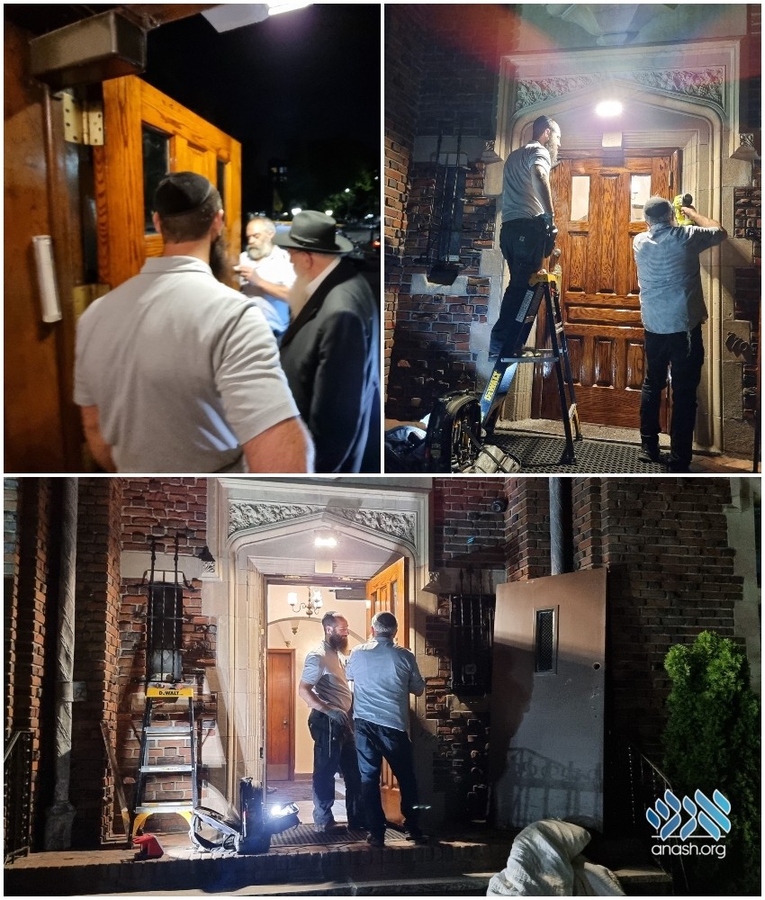 The iconic wooden front door of 770 was reinstalled Tuesday night after being taken for repairs and restoration last week.