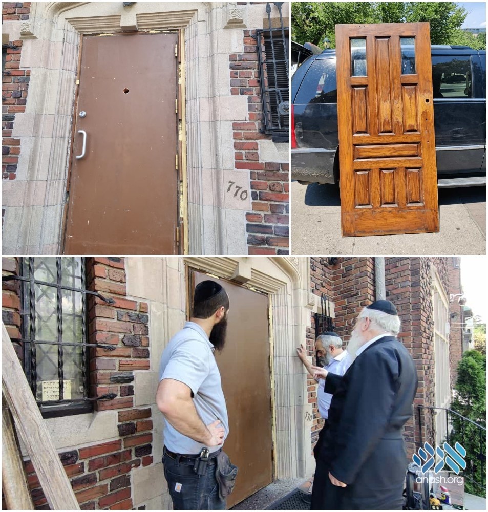 The iconic wooden front door of 770 was removed on Wednesday to be taken for repairs and restoration, with a temporary door installed in its place.