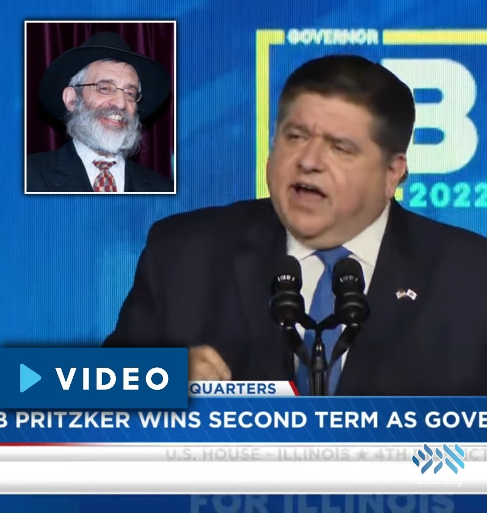 In his victory speech following his election win for his second term as governor of Illinois, Gov. JB Pritzker praised Shliach Rabbi Yosef Schanowitz for his response following the July 4th mass shooting in Highland Park.