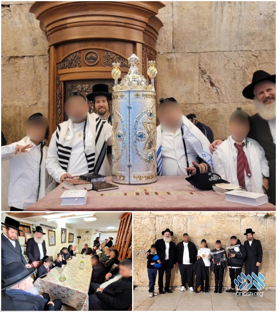 Harav Chaim Kahn, who accompanied the children, called each one to the Torah, and they made their brachos with great emotion. The mothers observed the custom of throwing candies from the Ezras Nashim, their tears of Jewish nachas flowing like water near the stones of the Kosel.