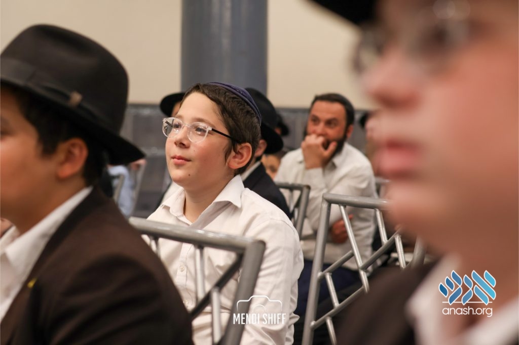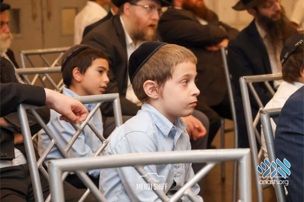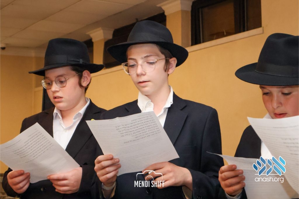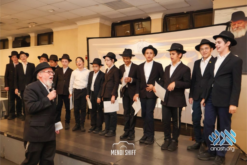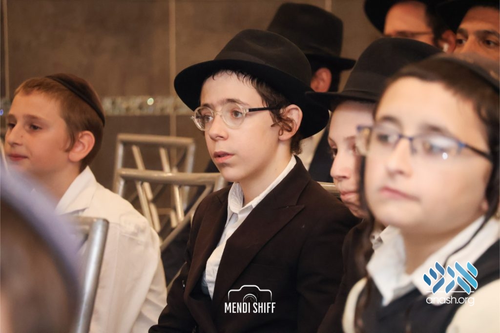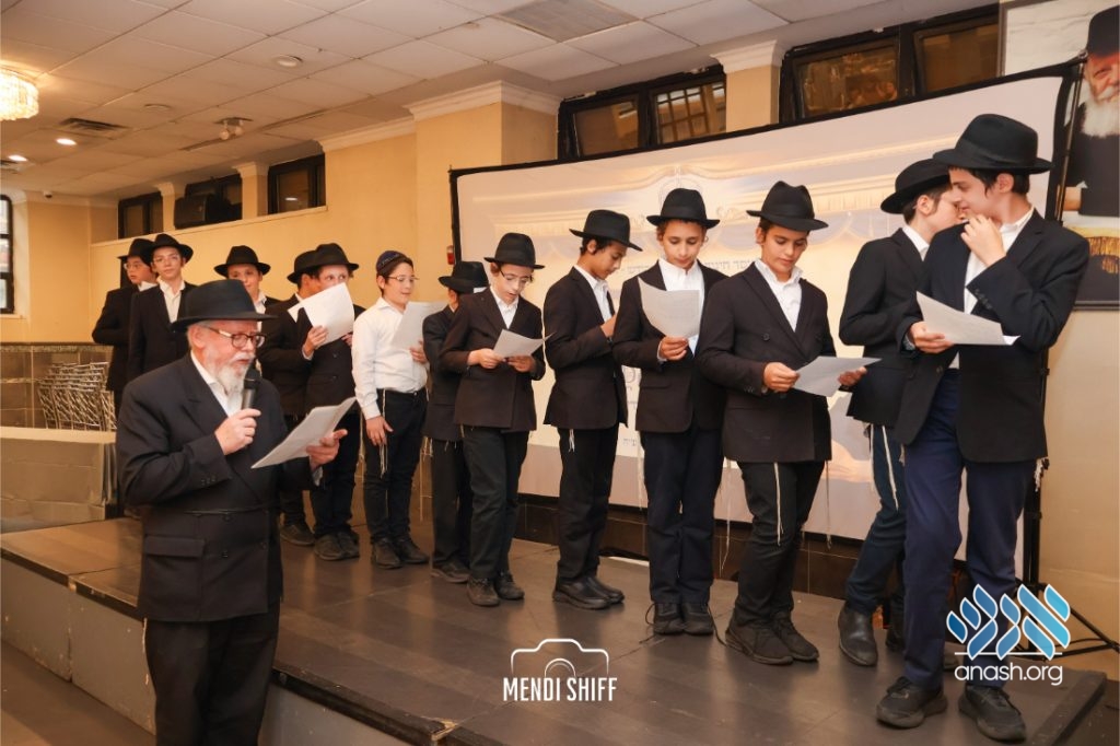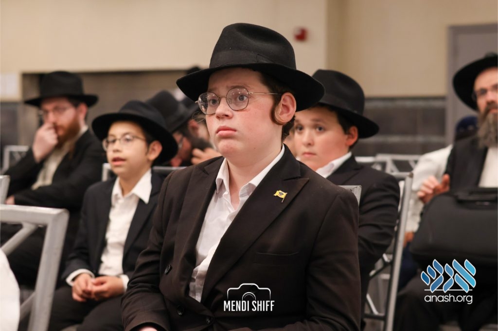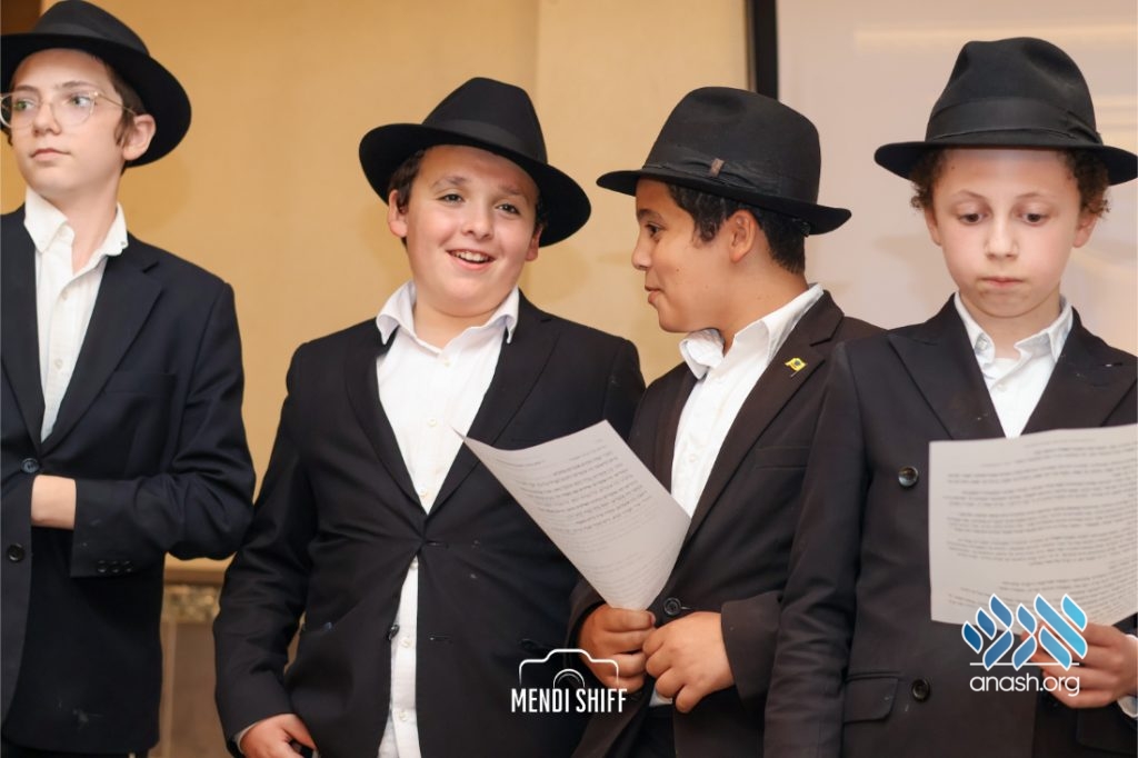 Kita Zayen then took center stage with a spirited presentation. First, they all made a siyum on Masseches Tomid as per the Rebbe’s request, led by their mechanchim Rabbi Yisroel Greenberg and Rabbi Chanoch Hecht. They also gave all a taste of the Kita Zayen experience as they sang a chassidishe niggun together.