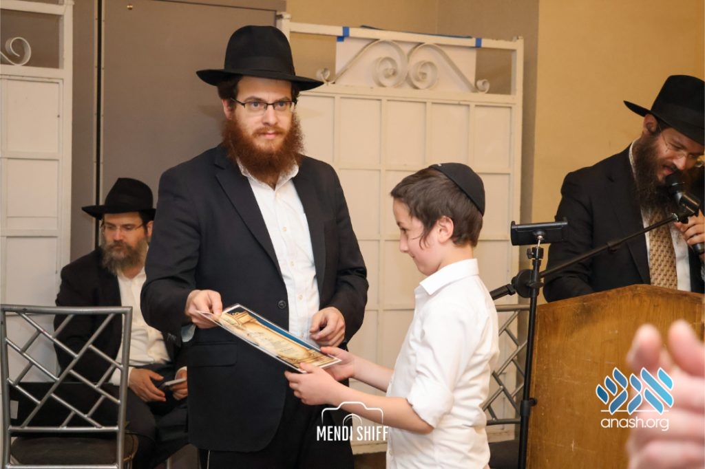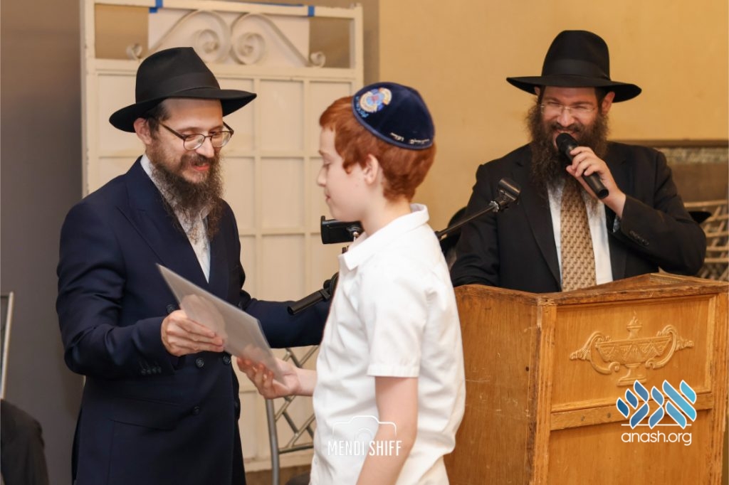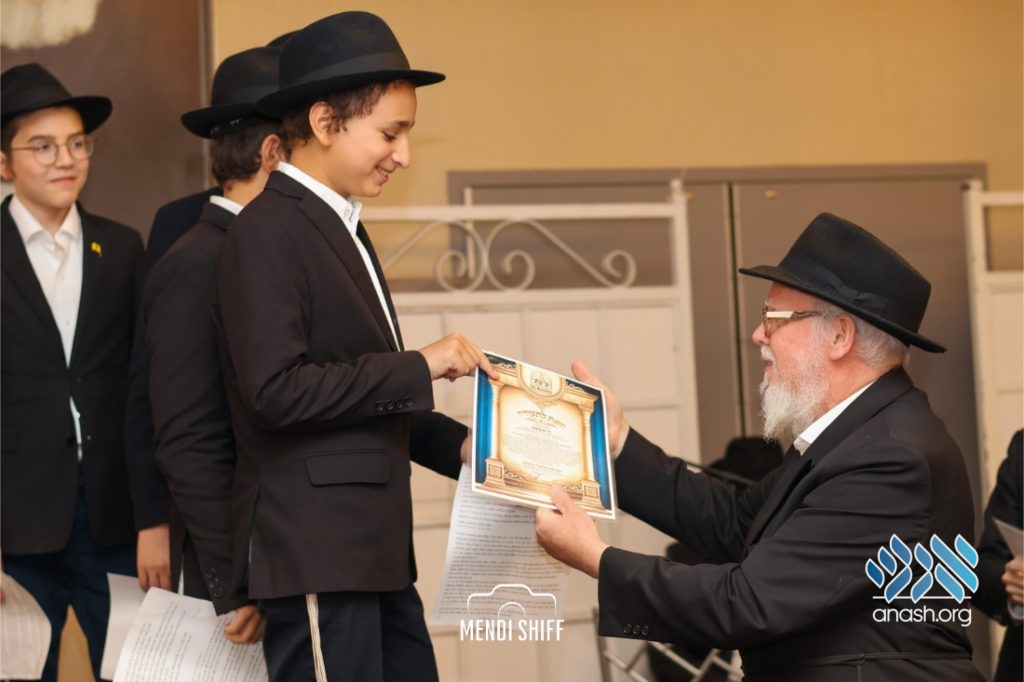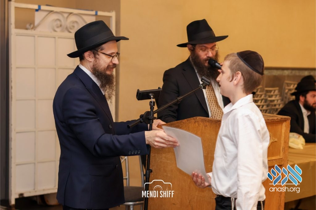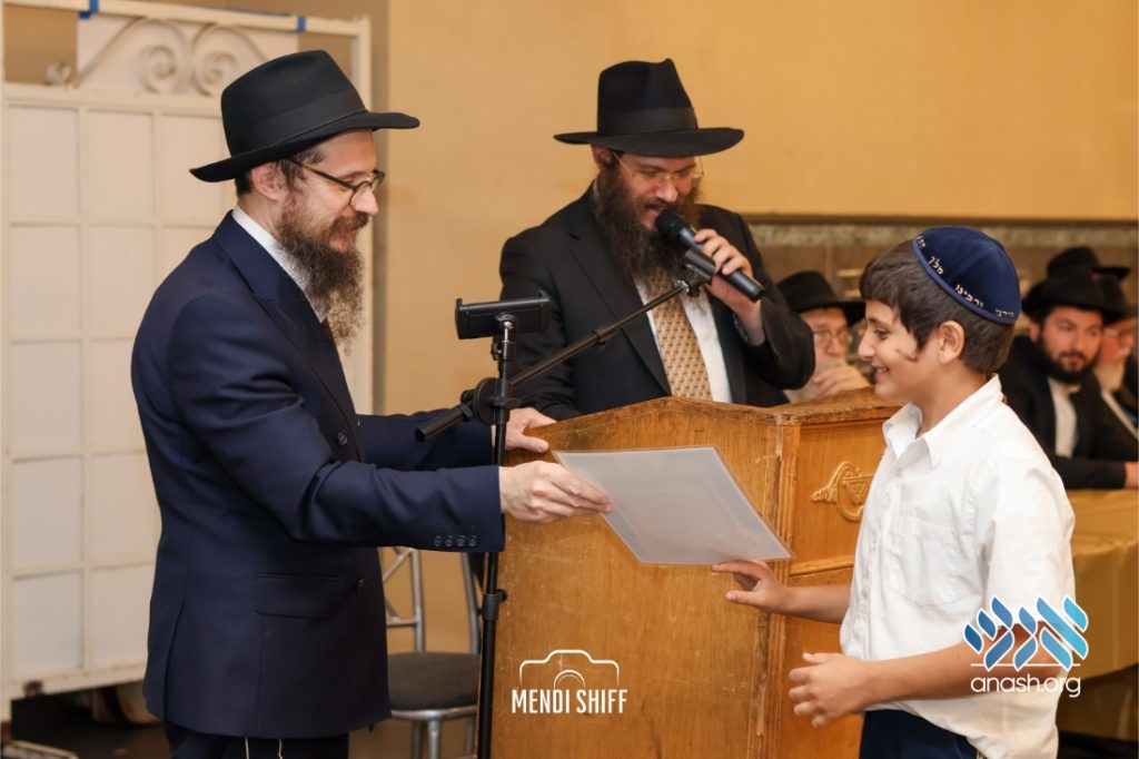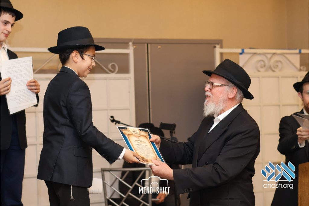 The vice principal, Rabbi Yossi Overlander, invited the highest-ranking Tzivos Hashem officers of the Cheder to lead us in the Twelve Pesukim. He also recognized great achievements of various talmidim in MBP with a special certificate for chassan and sgan hakita.