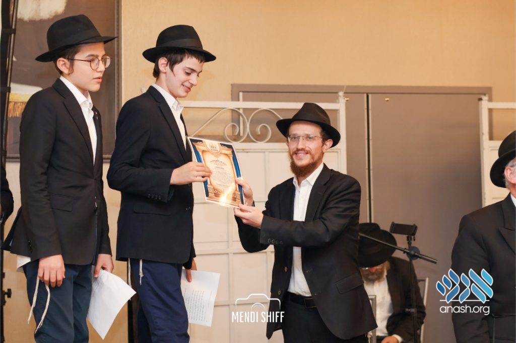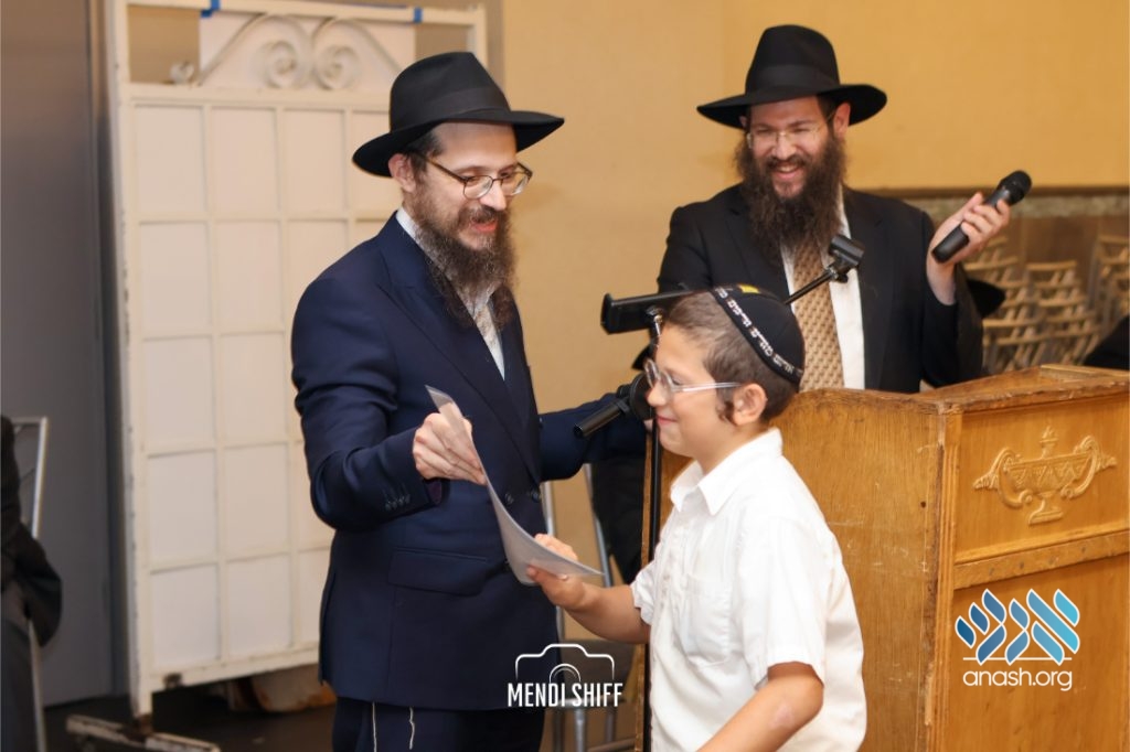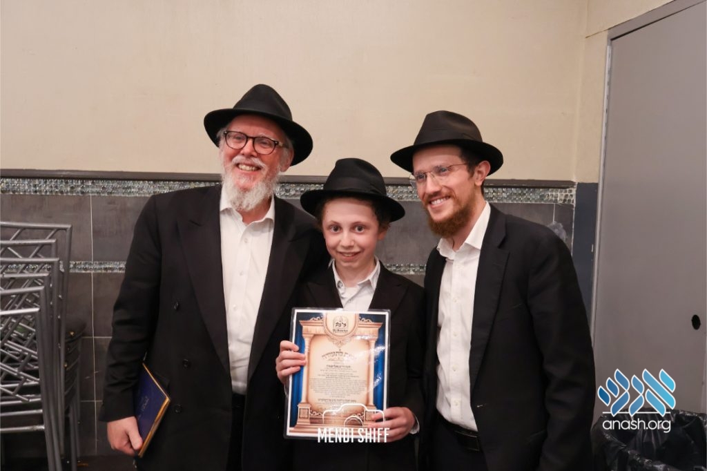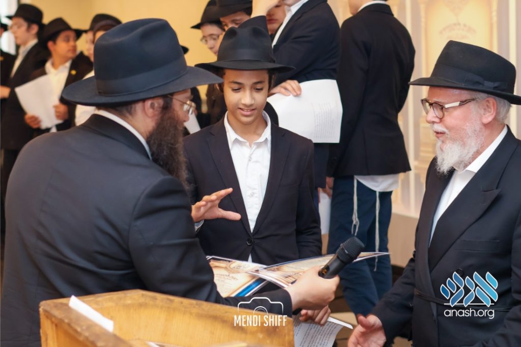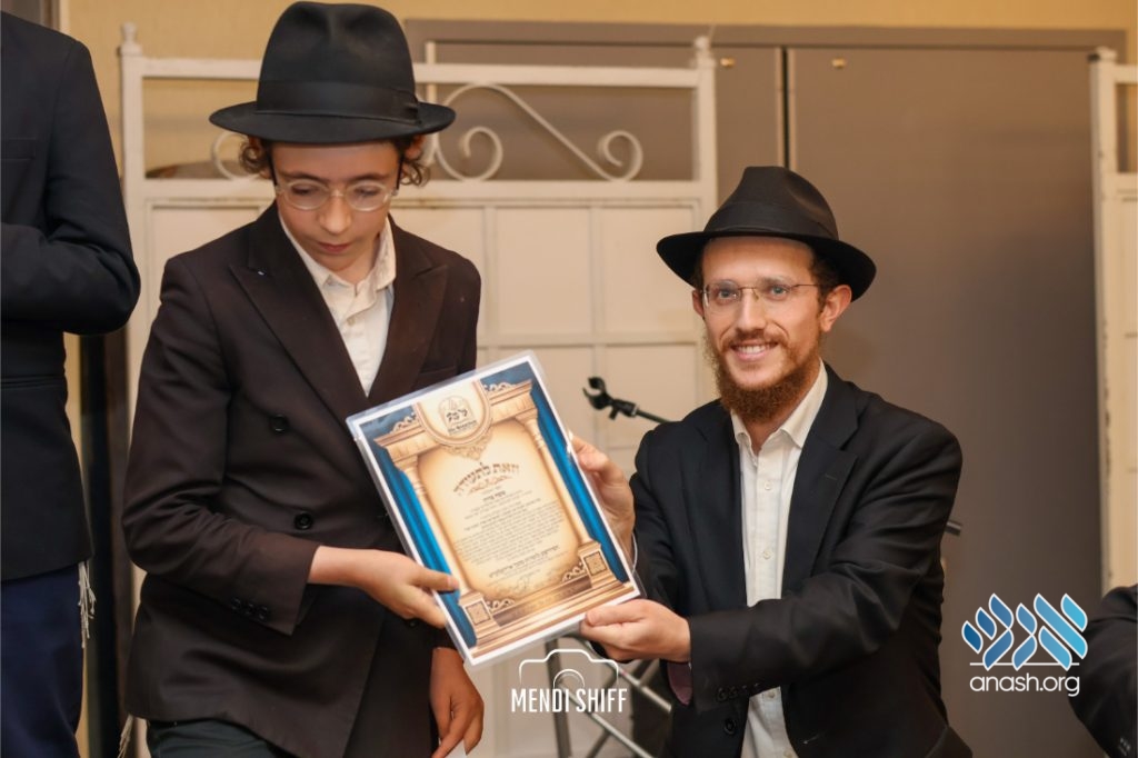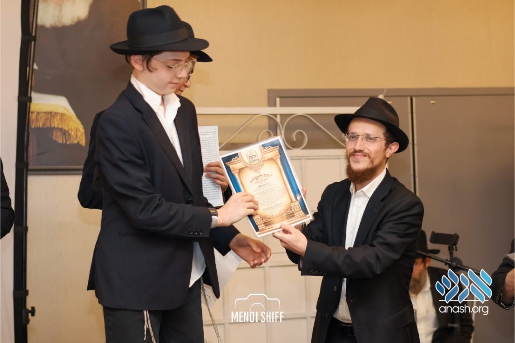 The vice principal, Rabbi Yossi Overlander, invited the highest-ranking Tzivos Hashem officers of the Cheder to lead us in the Twelve Pesukim. He also recognized great achievements of various talmidim in MBP with a special certificate for chassan and sgan hakita.