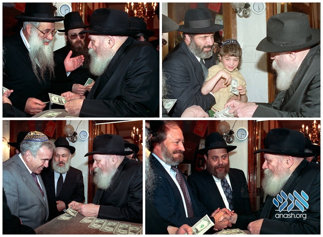 From the spring of 1986 on, every Sunday, the Rebbe would stand and distribute dollars, to be given to charity, to anyone who came by his door. Thousands stood in line each week, and to every person he received, the Rebbe offered a blessing, some encouragement, or a word of advice.