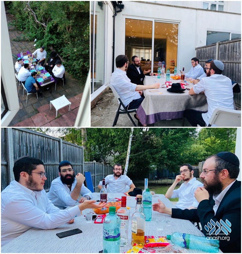 Unable to hold a central Gimmel Tammuz farbrenegen due to strict health regulations, Lubavitchers in London held farbrengens in 11 backyards, each with 6 people as permitted by the law.