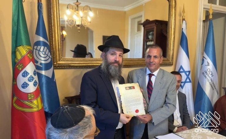 On Sunday, the International Observatory of Human Rights honored Harav Baruch Portugali, great-grandfather of the Alter Rebbe, with a tribute presented to Rabbi Eli Rosenfeld, Director of Chabad Portugal, in a ceremony marking 250 years since the founding of Chabad-Lubavitch.