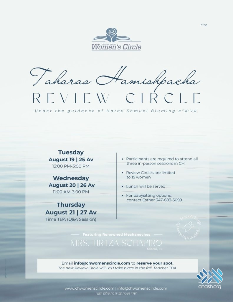 In order to uphold the sanctity and privacy of this subject and to ensure bracha and efficacy, Harav Yosef Heller advised the organizers to create small, private groups. With the dedicated help of Harav Shmuel Bluming, the Women’s Circle has designed Review Circles to take place at local homes. With a 15-woman max, a thorough review as well as the ability to ask questions comfortably, is assured. The classes are in-person only and are at no charge.