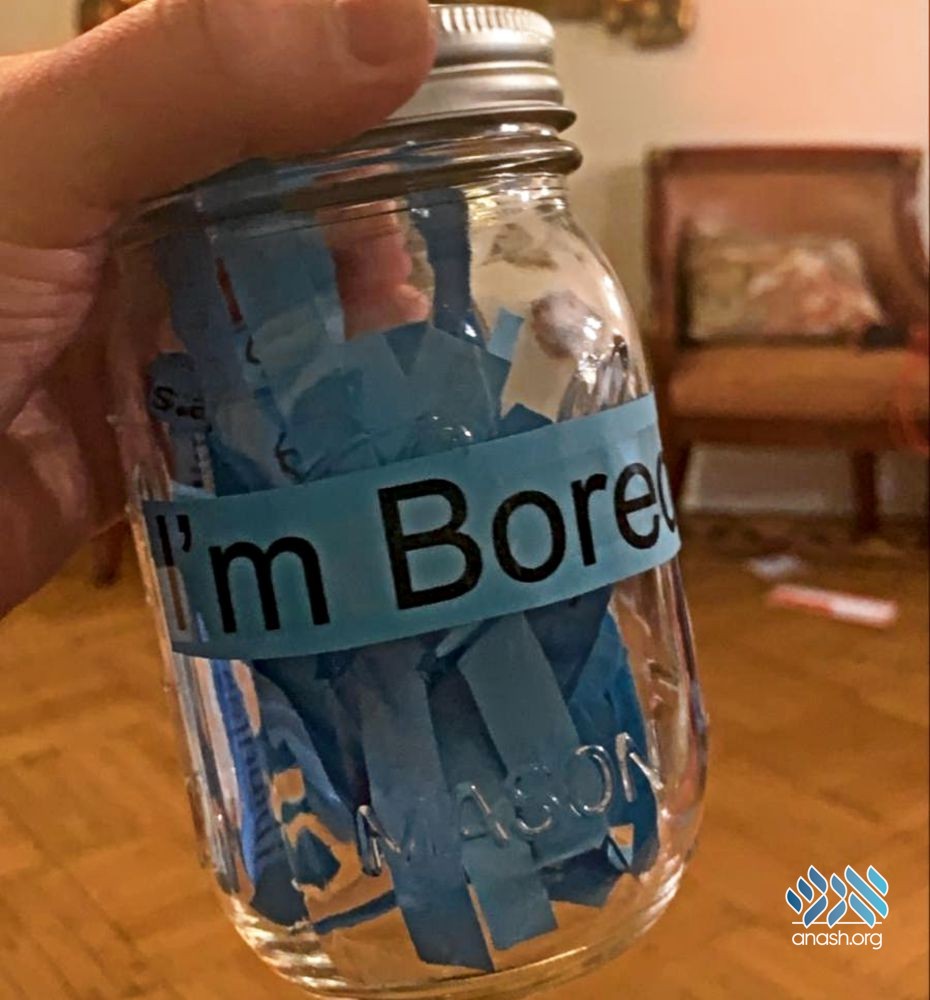- Are your kids saying they’re bored? Fill a jar with activities written on slips of paper, and when your children are bored, let them pull one out! Here’s a list of ideas from Between Carpools.