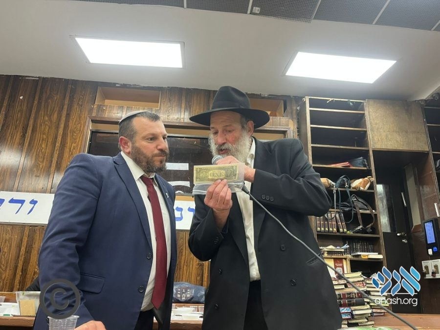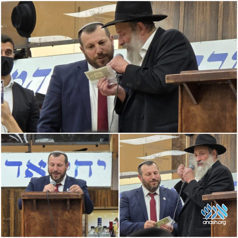 Knesset Member and Israel’s Minister of Heritage, Rabbi Amichai Eliyahu, addressed Anash and bochurim in 770 on Tuesday night during his visit to New York. Rabbi Menachem Gerlitzky presented him with a special dollar from the Rebbe.