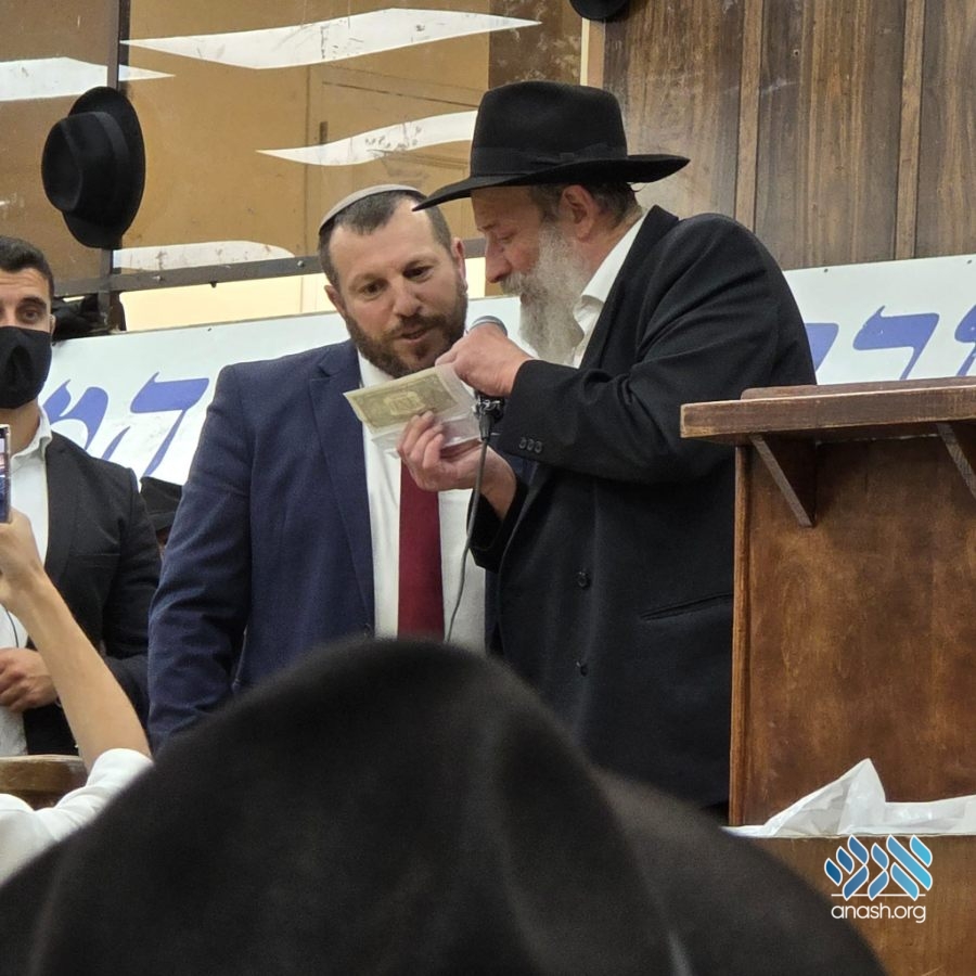 Following his remarks, which were received with great warmth, Minister Eliyahu was presented with a special dollar from the Rebbe by Siyum organizer Rabbi Menachem Gerlitzky.