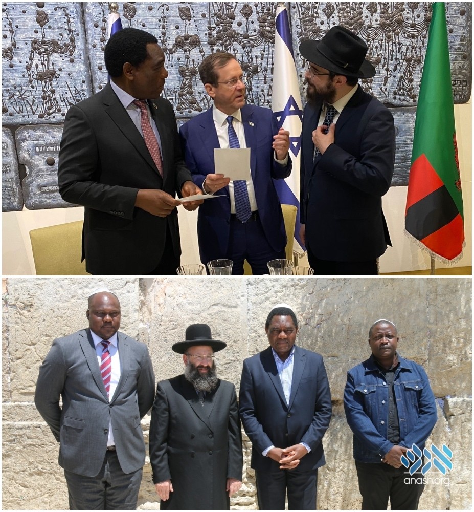 The president of Zambia and the country’s sole shliach met up during a state dinner hosted by Israeli President Isaac Herzog. The shliach had an invitation for the presidents.