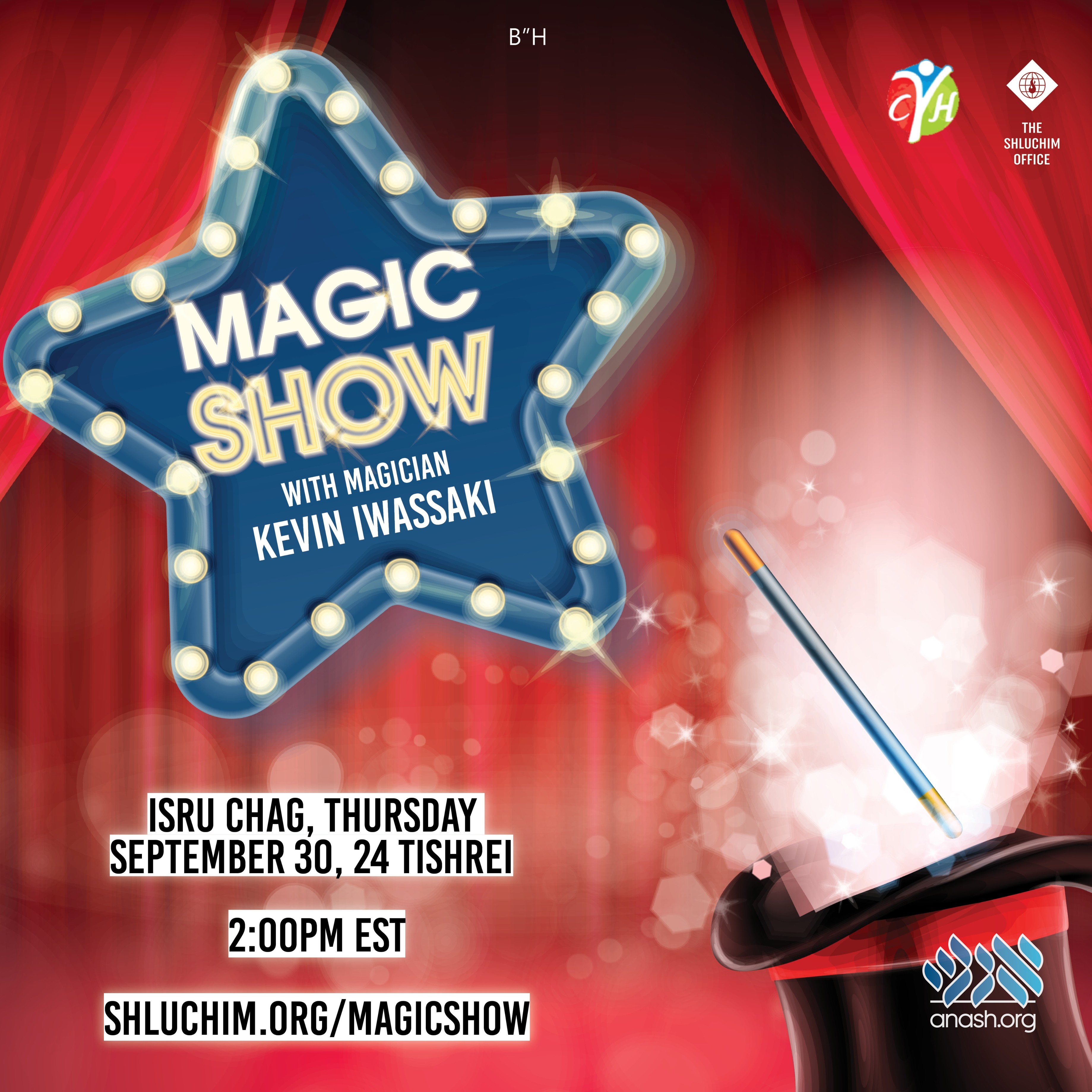 The Shluchim Office invites all Tzeirei Hashluchim to join a live magic show on Isru Chag with Magician Kevin Iwassaki, free of charge.
