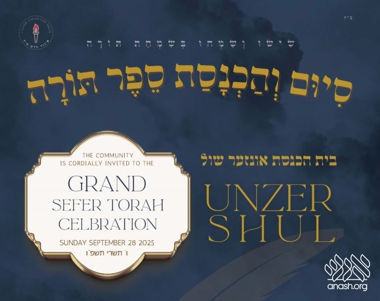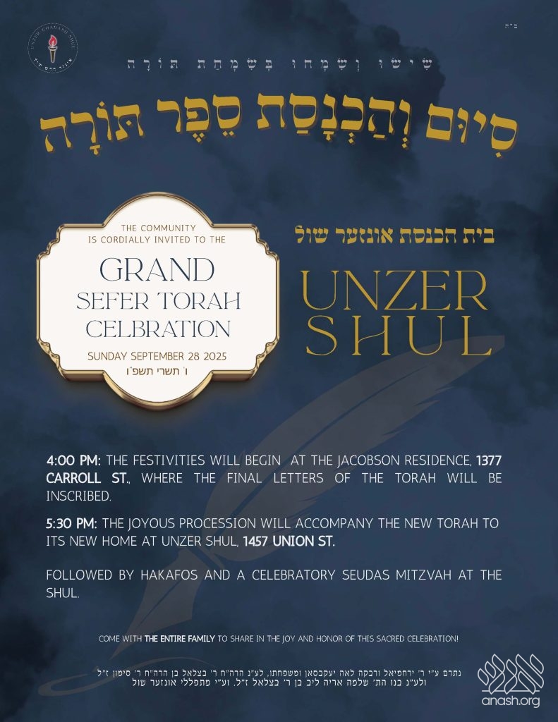 At 5:30 PM, a festive procession will escort the Sefer Torah to its new home at Unzer Shul, 1457 Union Street (corner Kingston Avenue).
