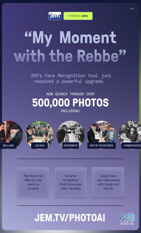 Imagine finding a never-before-seen photo of yourself or a loved one with the Rebbe. Thousands already have through JEM’s groundbreaking Face Recognition tool. Now, with over 500,000 searchable photos and powerful new features, it’s better than ever.
