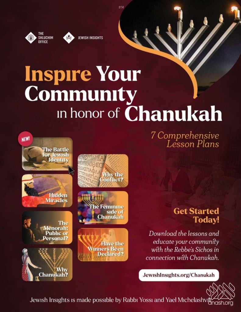 Jewish Insights, a weekly lesson series based on the Rebbe’s teachings and used in Chabad Houses worldwide, has released 11 free, ready-to-teach classes to help Shluchim inspire their communities for Yud Tes Kislev and Chanukah.