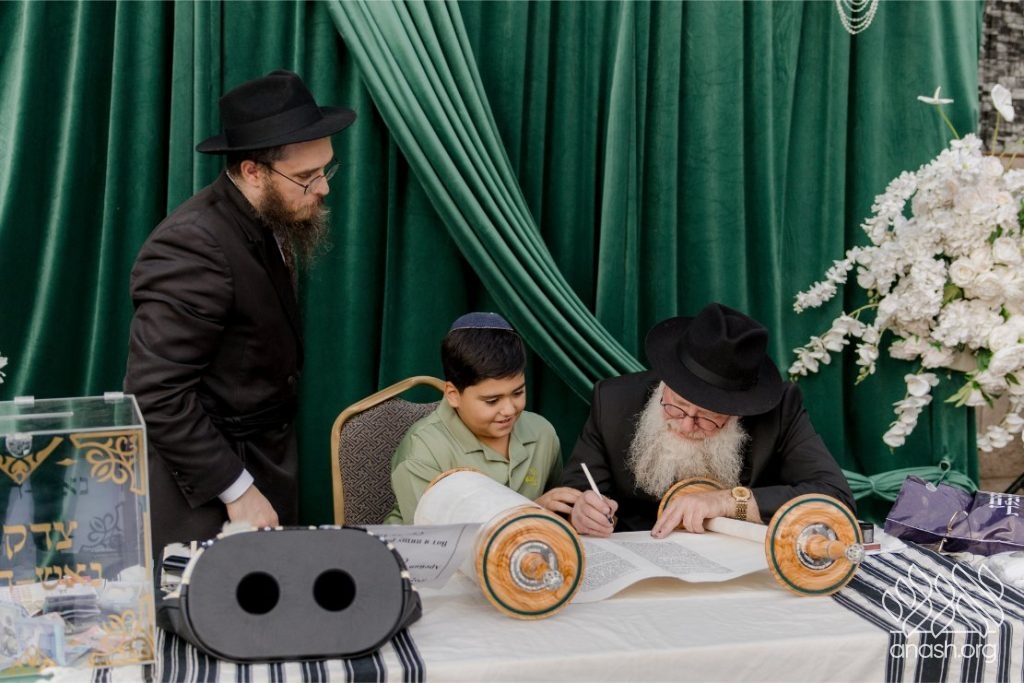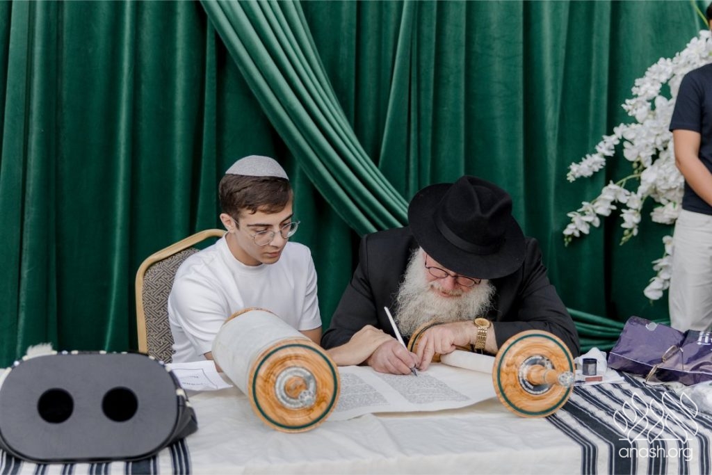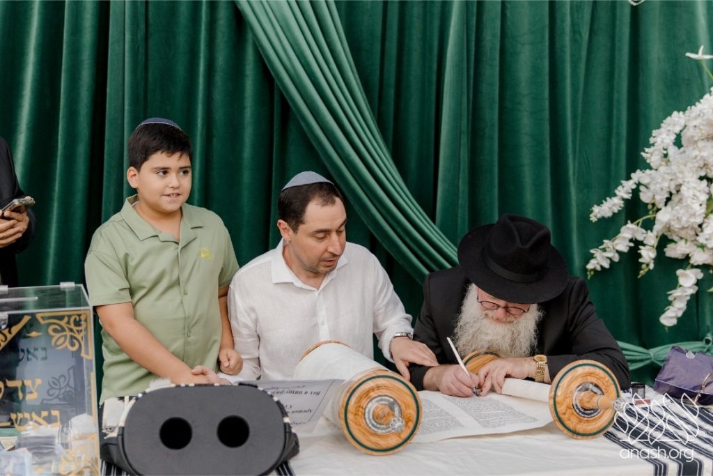In the courtyard of the Jewish Center, the writing of the final letters were written. The event deeply moved all the participants—families with their children, community members, and guests who were privileged to take part in the writing. The sofer, Rabbi David Yoel Winfeld from the Eretz Yisroel, arrived especially for this occasion. Everyone who came to write a letter was warmly greeted by him with a smile, a handshake, and a “mazal tov.” The children, the next generation, were honored with writing the final letters, thus completing the scroll.