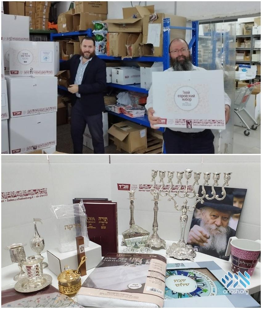 The kits include a white tablecloth for Shabbat, crystal salt cellar, challah tray and cover, charity ‘pushke’ box, candlesticks for Shabbat candles, hand washing cup, a honey dish, menorah, besomim spice box and candle holder for havdalah, siddur ,tehilim and chumash in Russian, mezuzah, kiddush cup, themed dolls for the children and much more.