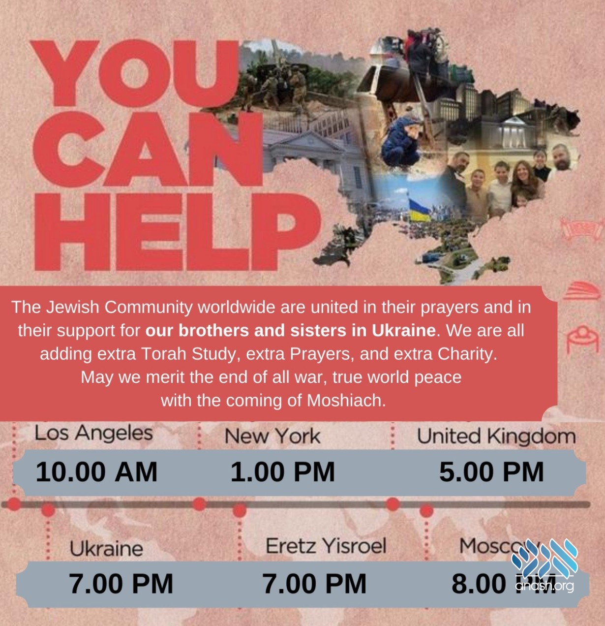 Jews around the world, especially Jewish Children, will gather for 15 minutes of Torah, Tefillah and Tzedakah for the safety and security of our fellow Yidden in Ukraine.