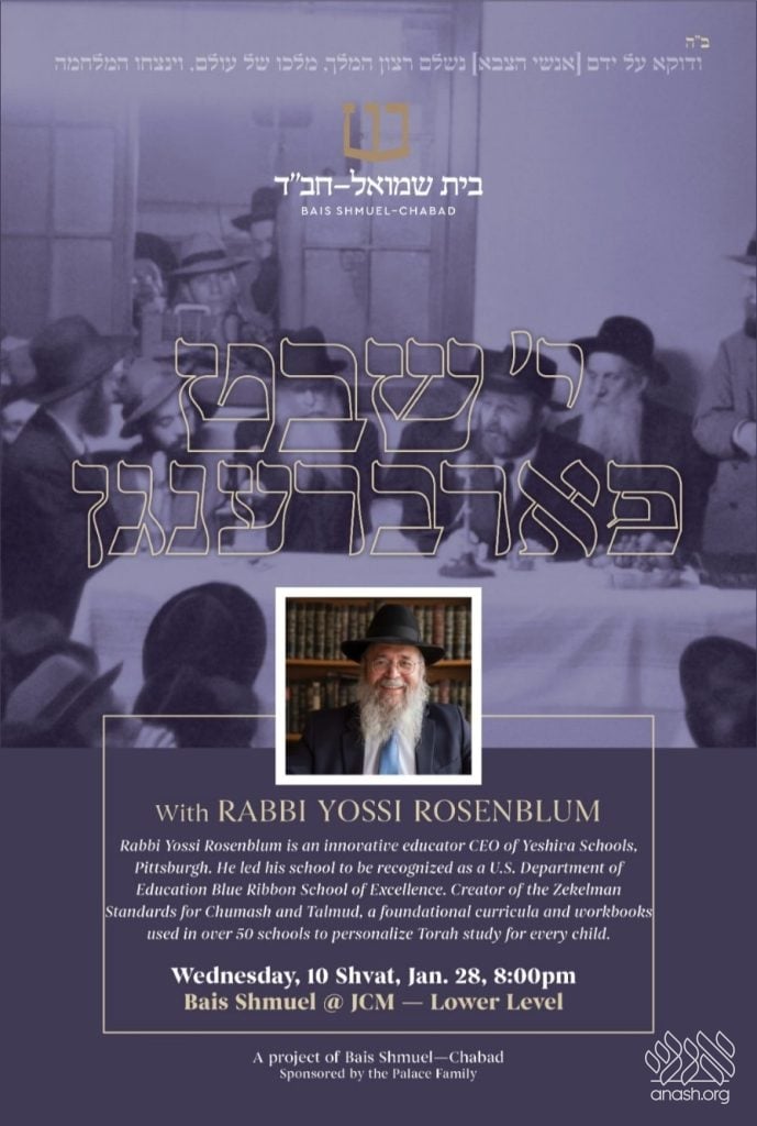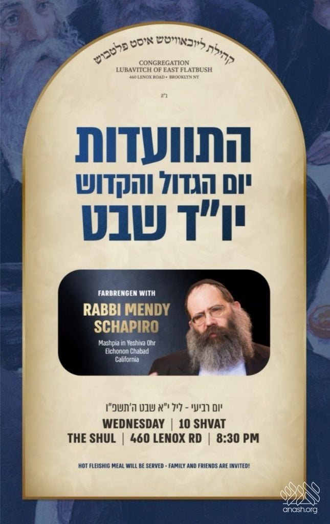 Farbrengens will be held in Crown Heights over the next few days to mark Yud and Yud-Alef Shevat, the hilula of the Frierdiker Rebbe, and 75 years of the Rebbe’s accepting the nesius. Choose one from Anash.org’s list.