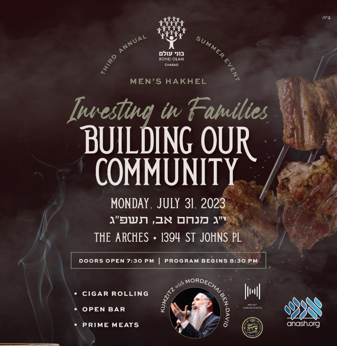 Men, you won’t have to leave the neighborhood this year to show your support. Join us at the Arches, a beautiful venue right here in Crown Heights, for an extraordinary evening featuring an open bar, cigar rolling, gourmet meat buffet and a kumzitz with Mordechai Ben-David and so much more.