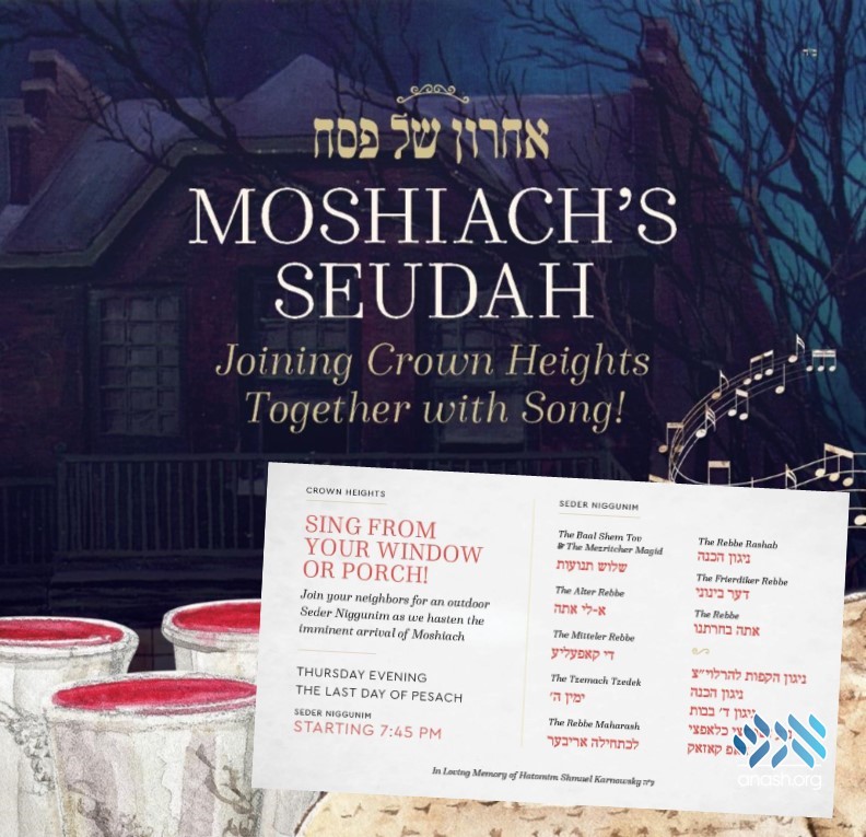 Come out on your porch or stand by your window and join in a community-wide Moshiach’s Seudah. At 7:45 pm on Thursday, we will all gather, while social distancing, to sing the Rebbeim’s niggunim.