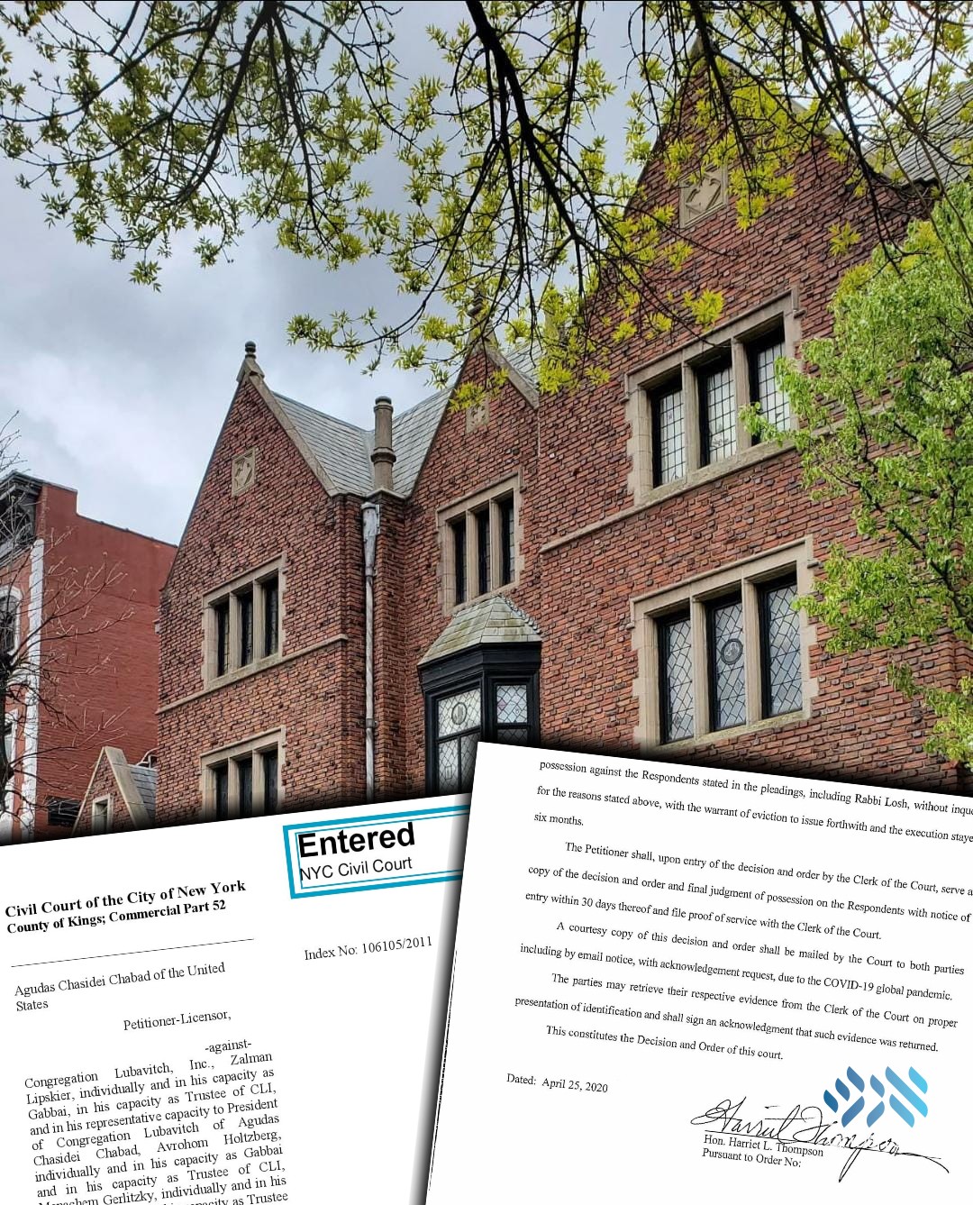 In the verdict, handed down April 25, 2020, the judge ruled that the full authority of how to run the buildings at 770, 784 and 788 Eastern Parkway, including the main shul, is in the hands of Merkos and Aguch.