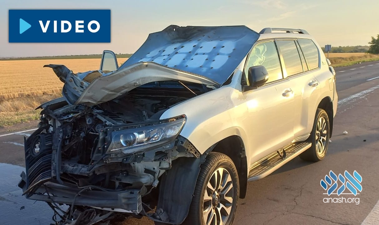 Miracle in Ukraine: While driving with his family, the car of Kherson shliach, Rabbi Yosef Yitzchak Wolf, was hit directly by a Russian drone at the front of the car. He and his family miraculously emerged unharmed.