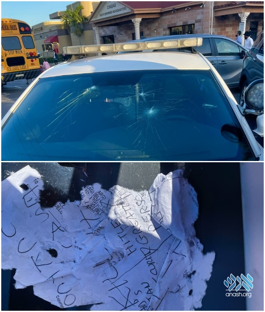 The perpetrator shattered one of the windows of the police car and left derogatory and bigoted messages before fleeing the scene. Fortunately, the Chabad center was unharmed.