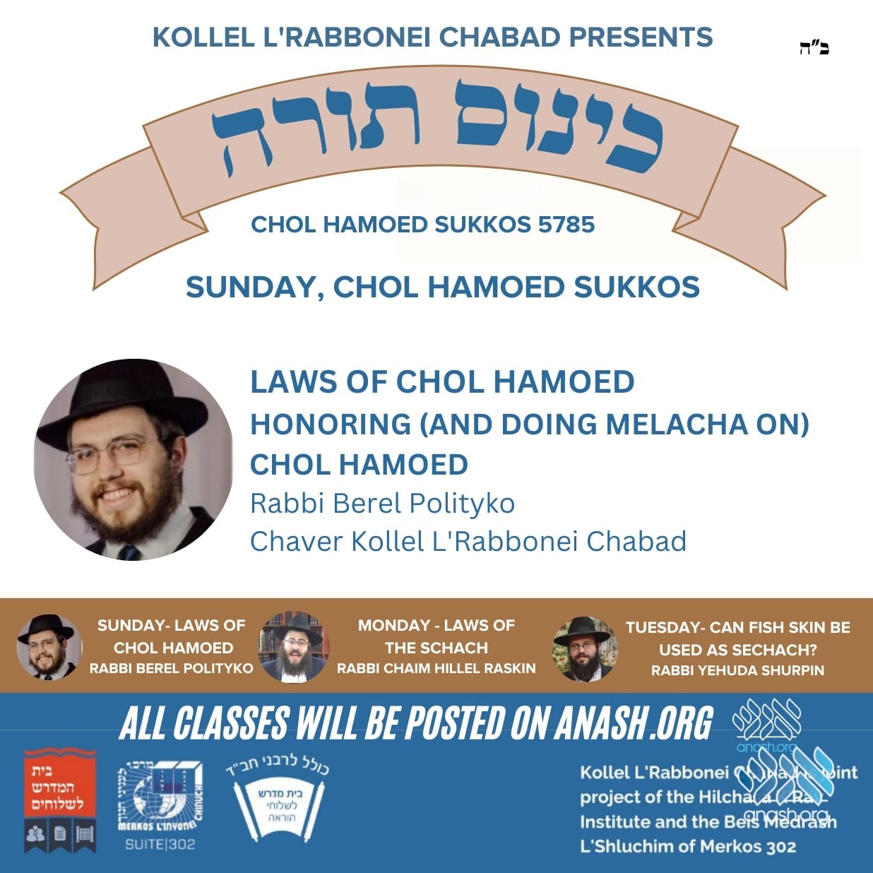 The first shiur for Sunday, the first day of Chol Hamoed, is given by HaRav Berel Polityko on Hilchos Chol HaMoed and discusses the sugya of honoring and doing melocha on Chol Hamoed.
