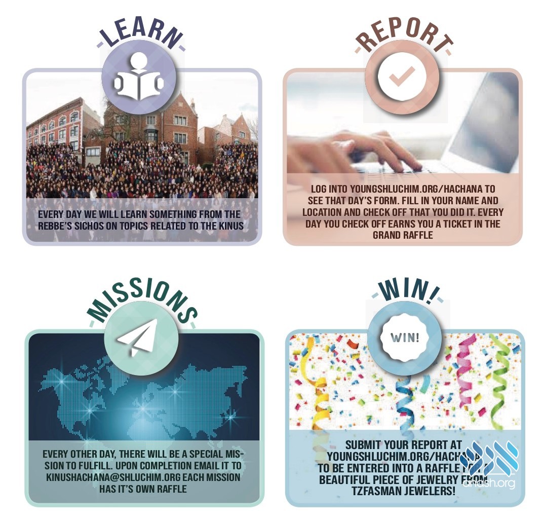 The Hachana package is available for download at youngshluchim.org/girlshachana, and comes complete with learning, interactive activities, and opportunities to enter in an exciting raffle.